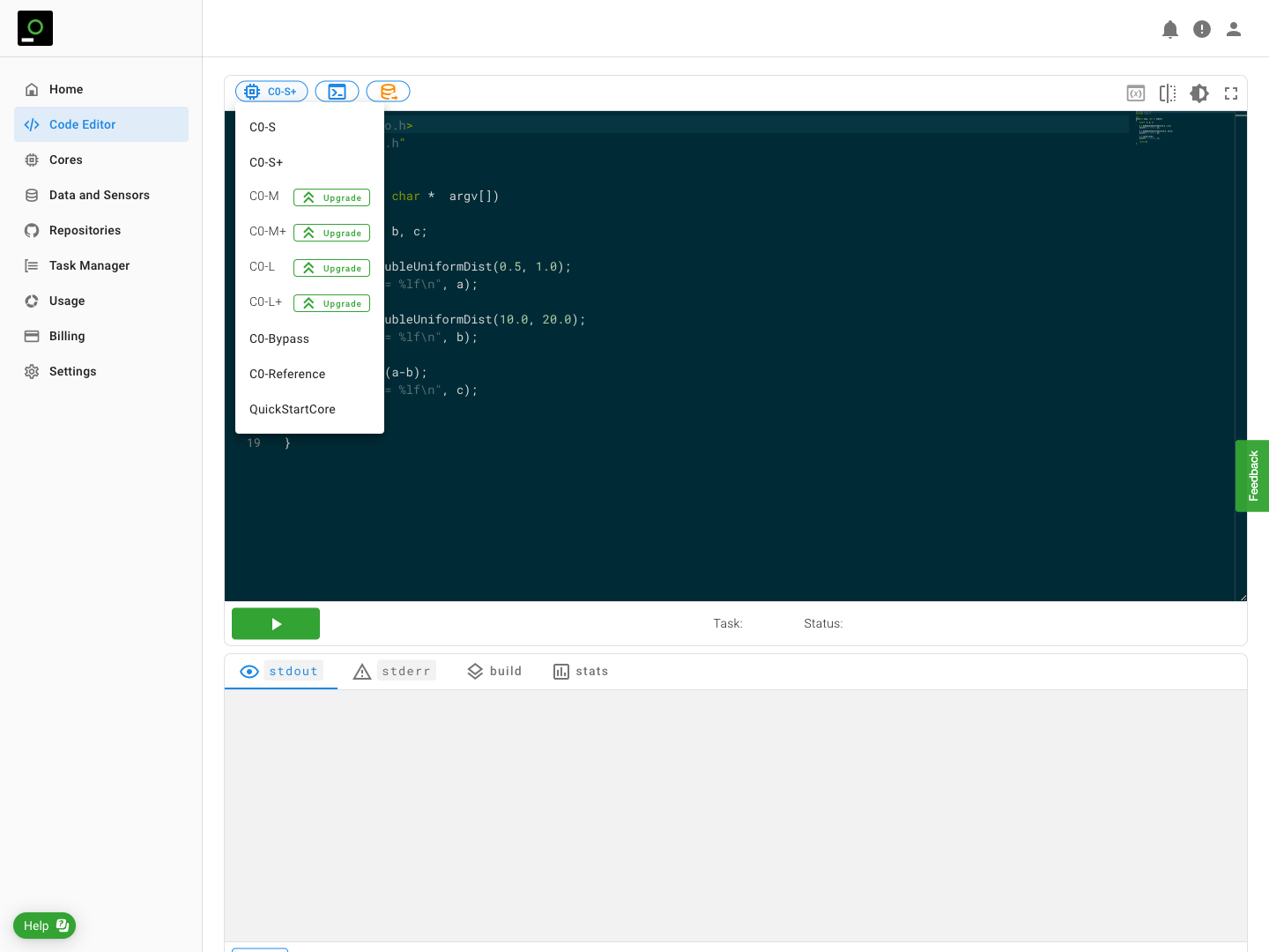 When running an application the Signaloid Developer Platform allows you to chose the Signaloid C0 Processor Core the application will run on. Click on the Core Selector Icon in either the Code Editor page (Figure 5, below) or the Repositories page (Figure 6, below) to bring up the list of availible cores. Select the custom Signaloid C0 Processor Core from this list and then run the application as normal. Signaloid Cloud Compute Platform will compile your application and run it on the Custom C0 Processor Core.