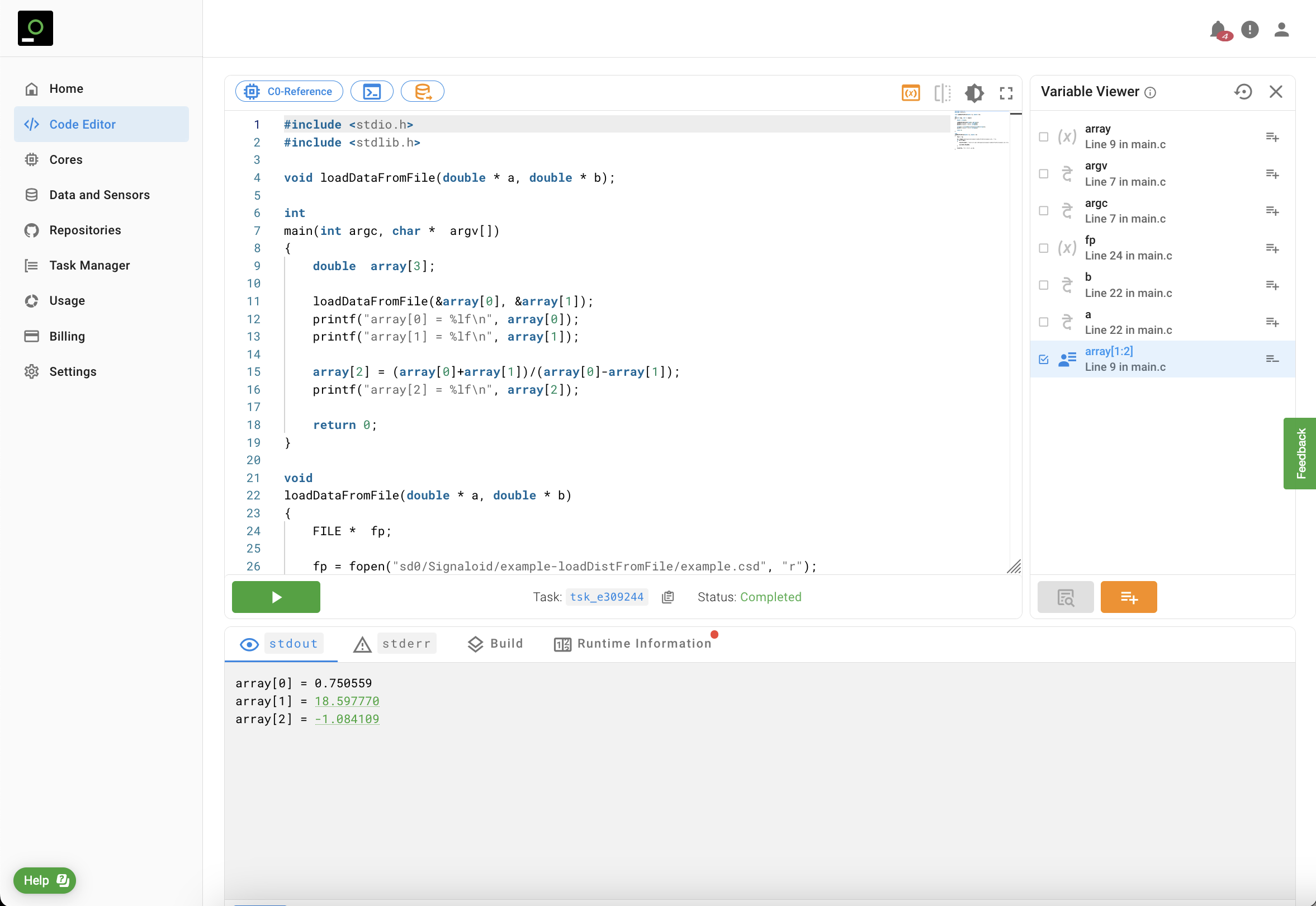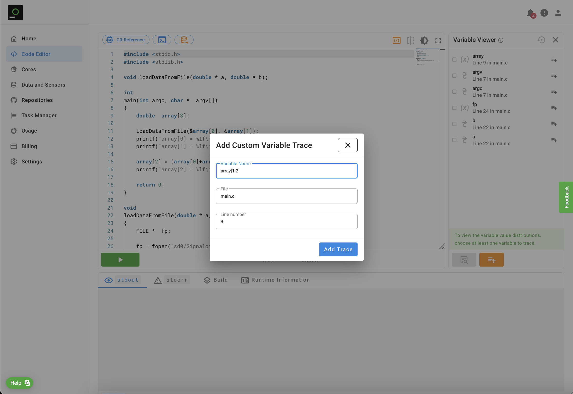 array variable of the source code. To ask the Signaloid Cloud Developer Platform to trace elements array[1] and array[2] you need to add array[1:2] as the "Variable Name". In the field "File" you need to enter the file where you define the array variable. For Code Editor runs by convention the file name is main.c. You also need to specify the line number of the declaration of array. For the specific example this line number is nine, and corresponds to double array[3].