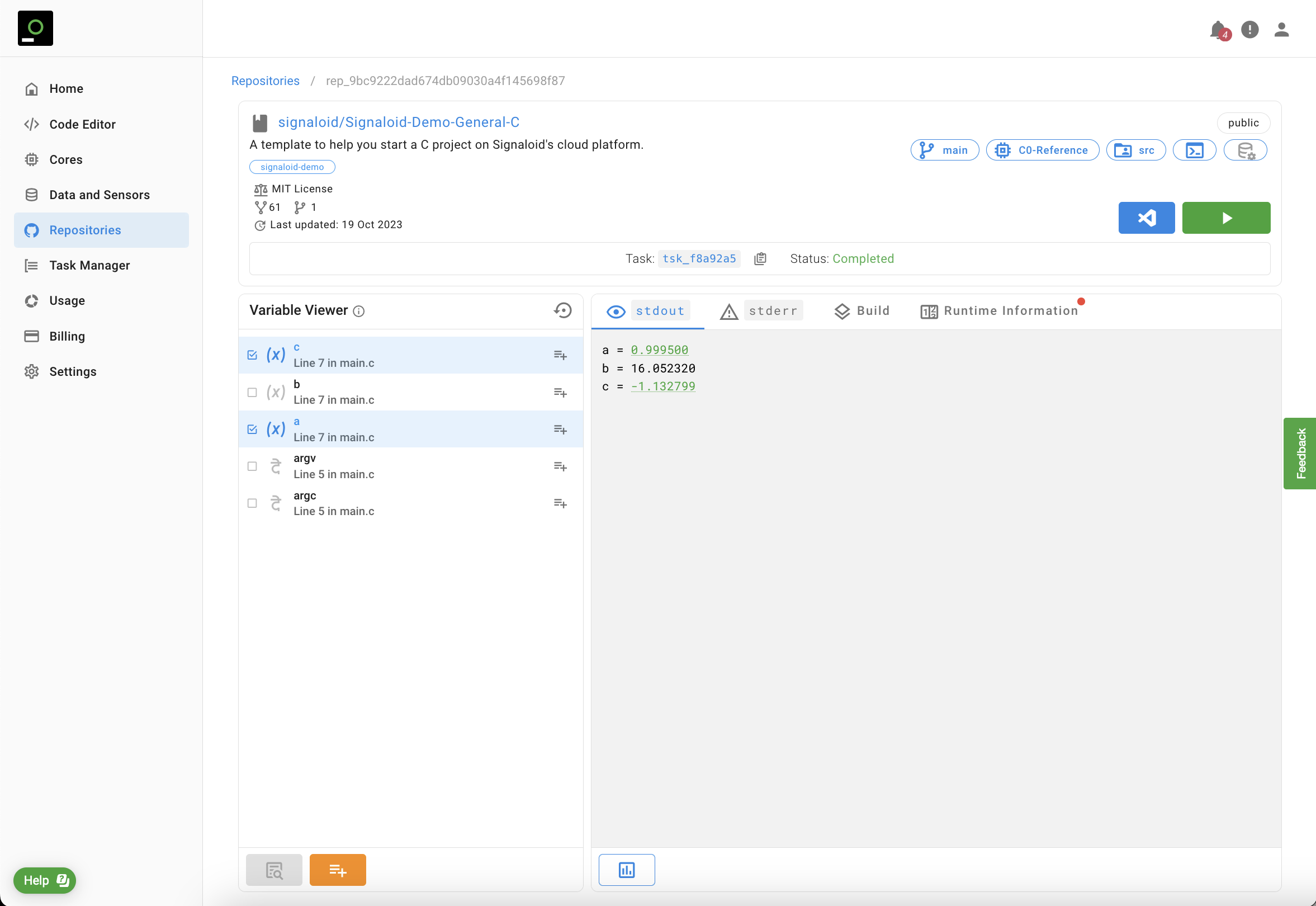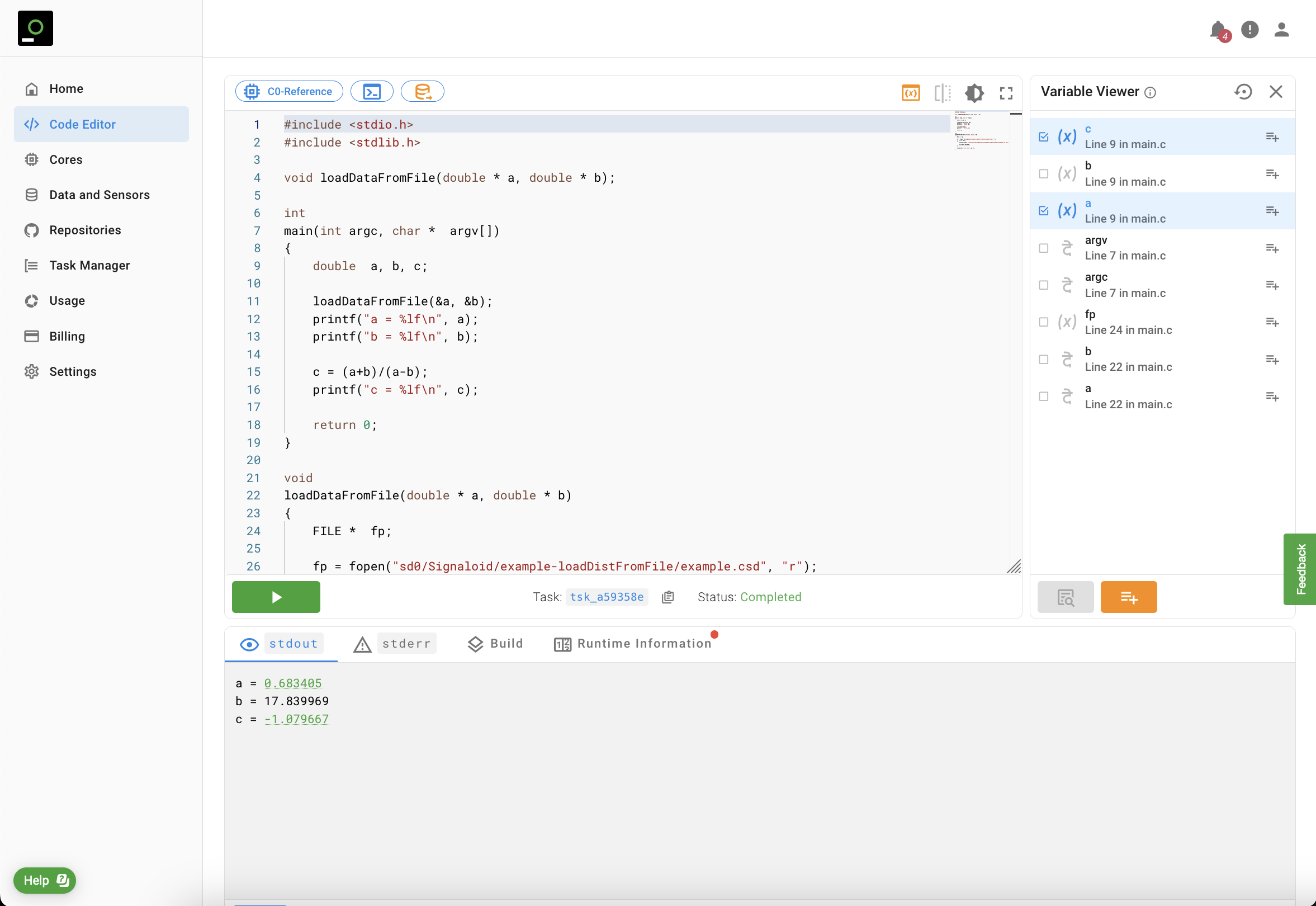 that you wish to trace. In this way, the Signaloid Cloud Developer Platform can uniquely identify the variable that you want to trace. Using the "Variable Viewer", available both for source code and repository runs, you can see all the variables