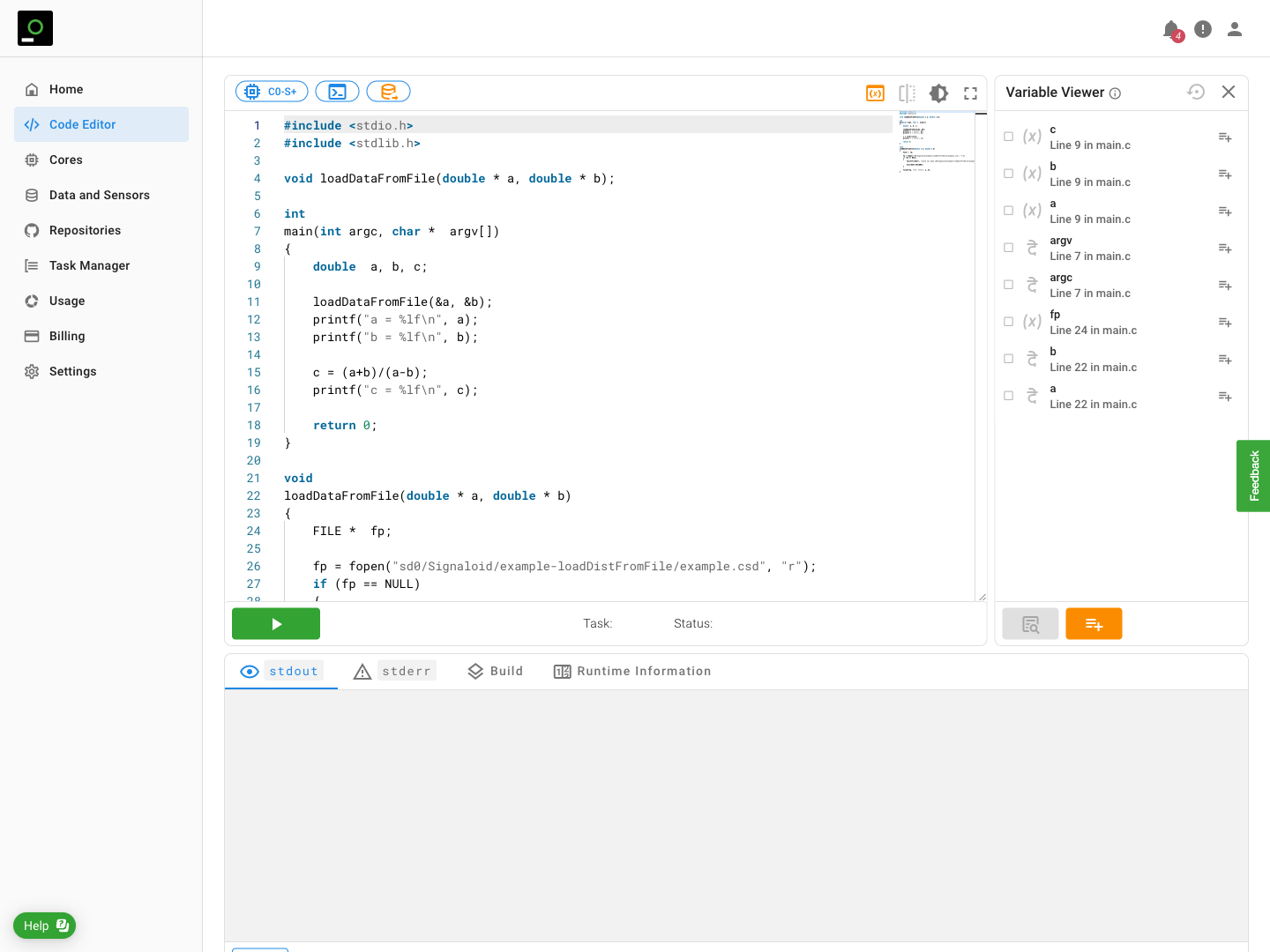 The following will guide you on how to execute applications on C0 Reference cores as well as how to instruct the Signaloid Cloud Developer Platform about which variables of your source code you want to trace. Running your application on C0 Reference cores requires the same steps as running a source code or repository task on any other Signaloid core, e.g., C0-S, C0-S+, C0-bypass, etc. To run your source code or repository application on C0 Reference cores, you only need to select the reference core from the drop-down list of your available cores. You can pass command line arguments and mount data sources for applications running on C0 Reference in the same way that you do for applications running on any other Signaloid C0 core.
