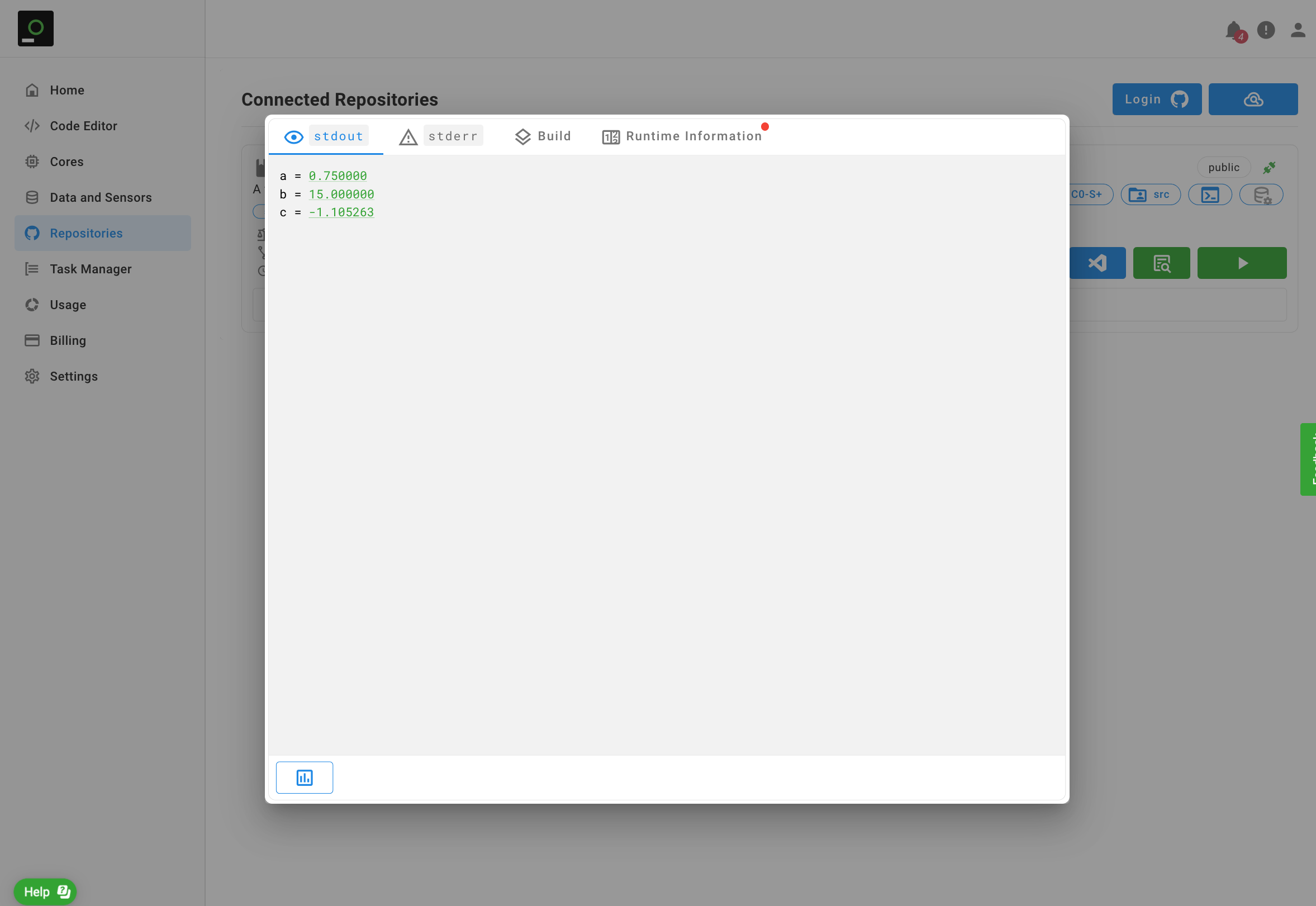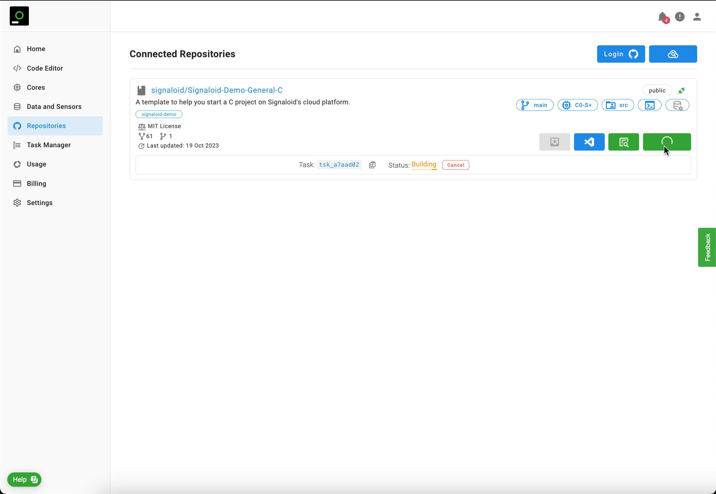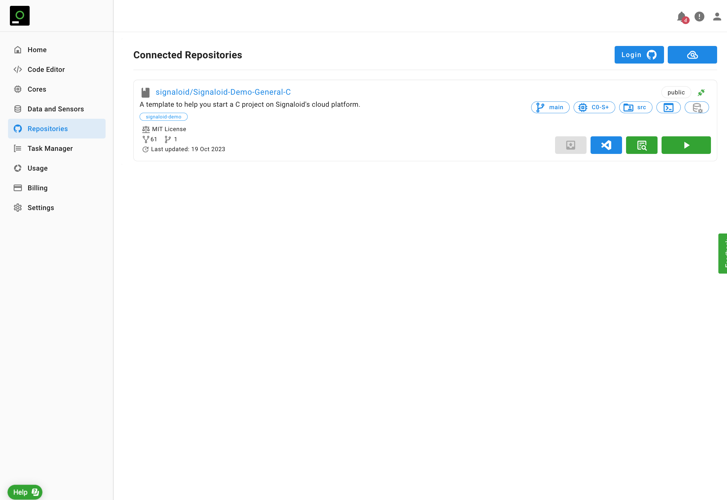 The Signaloid Cloud Developer Platform Repositories page provides a way for developers to compile and execute existing code contained in GitHub code repositories.