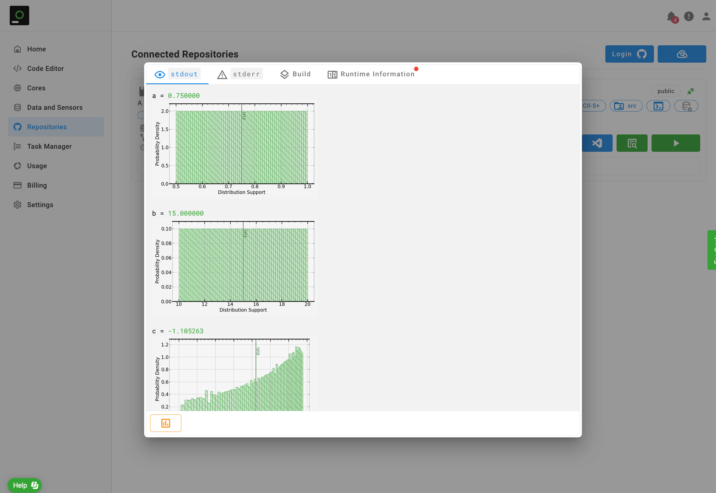 at the lower left of the stdout tab to instruct the Signaloid Cloud Developer Platform to show the distributional