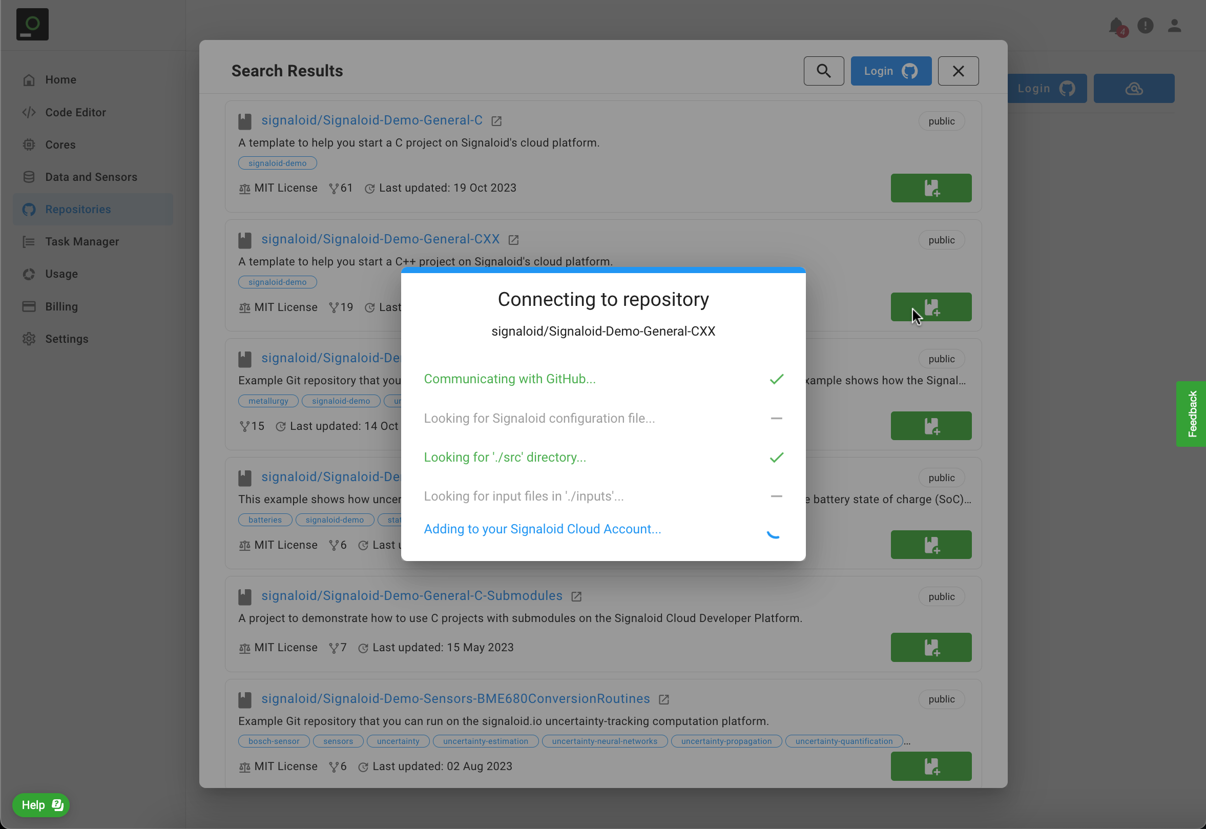 You can connect a repository by clicking the "Connect to Repository" green button () attached to every repository in the search dialog, as you can see in Figure 1. Depending on your Signaloid account Tier, there is an upper bound to the number of repositories that you can have simultaneously connected. If you have logged in to GitHub from the Signaloid Cloud Developer Platform then the "Connect to Repository" green button () also appears at the Repositories page and enables you to search and connect your private repositories. When you connect a private or public repository, the Signaloid Cloud Compute Platform performs a number of checks on the repository as Figure 2 shows. The checks examine the structure of the repository and look for files that assist the build process of the repository on the Signaloid Cloud Compute Engine (see Repository Building Configuration Options for more details).