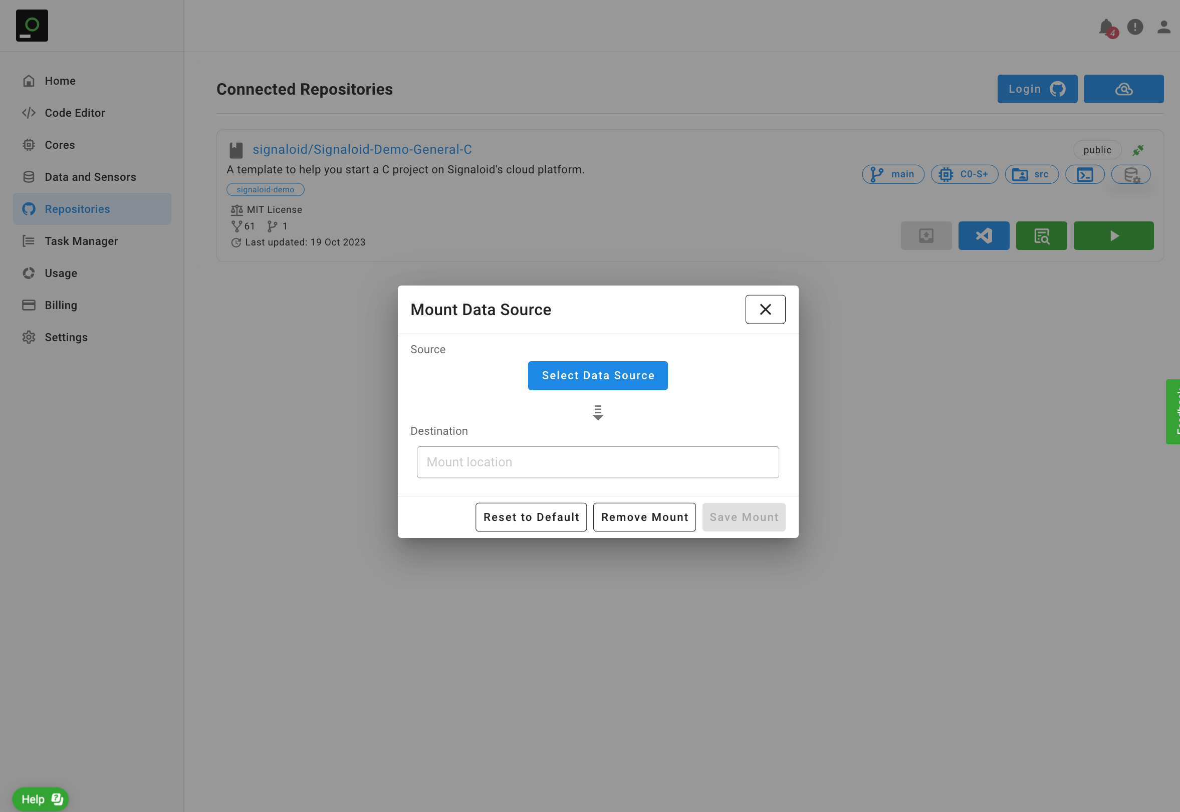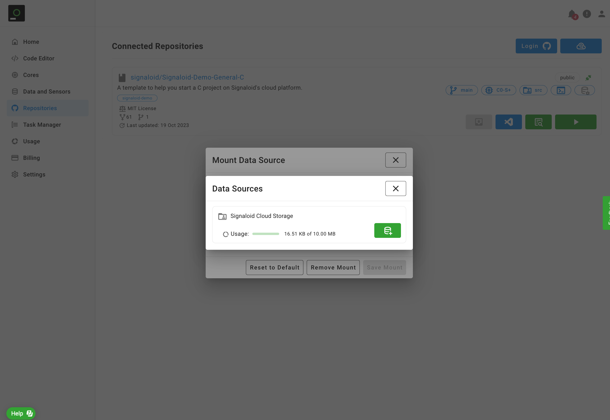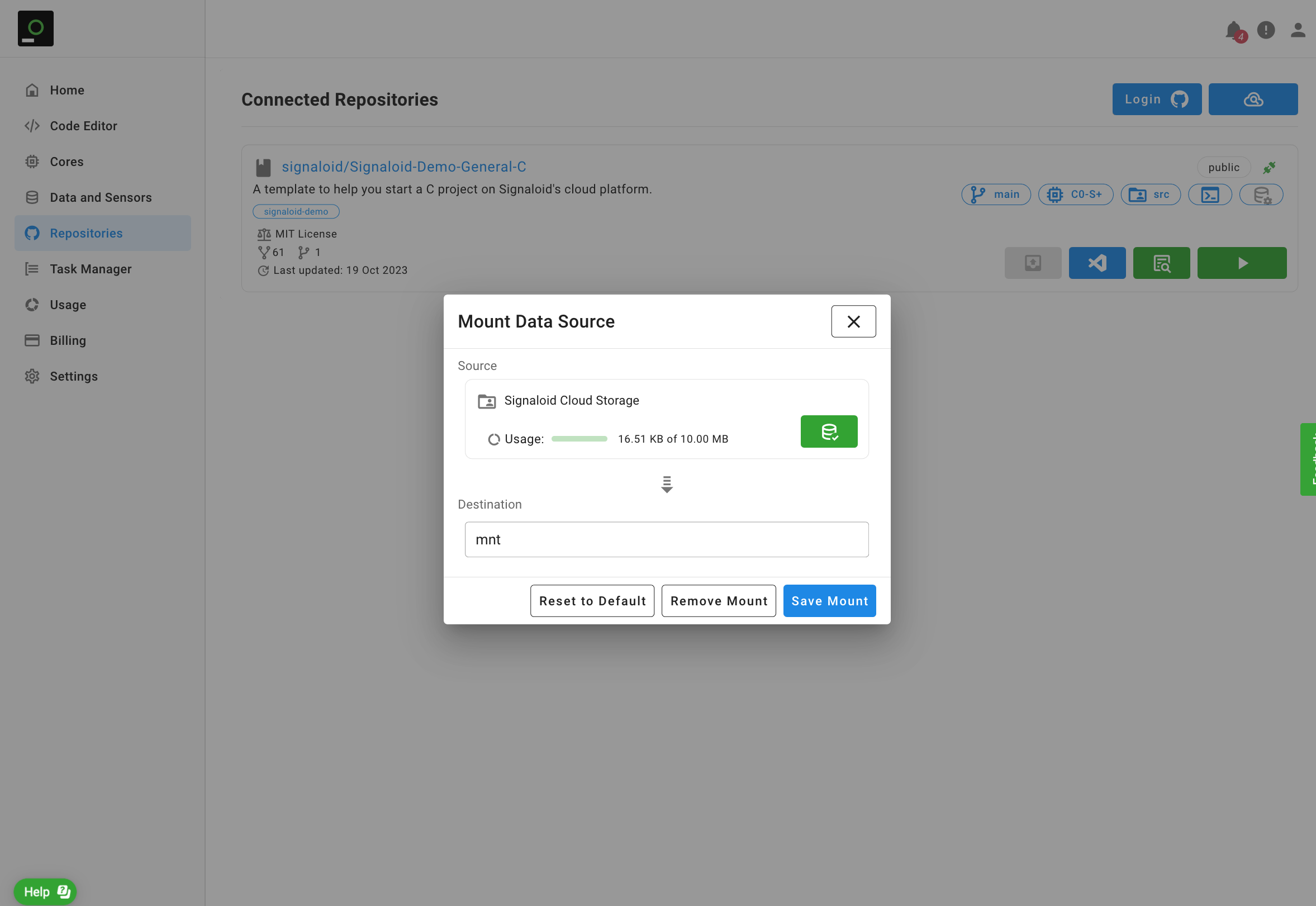 the mounting process. Your connected repository can then read and write to files in your Signaloid Cloud Data Storage