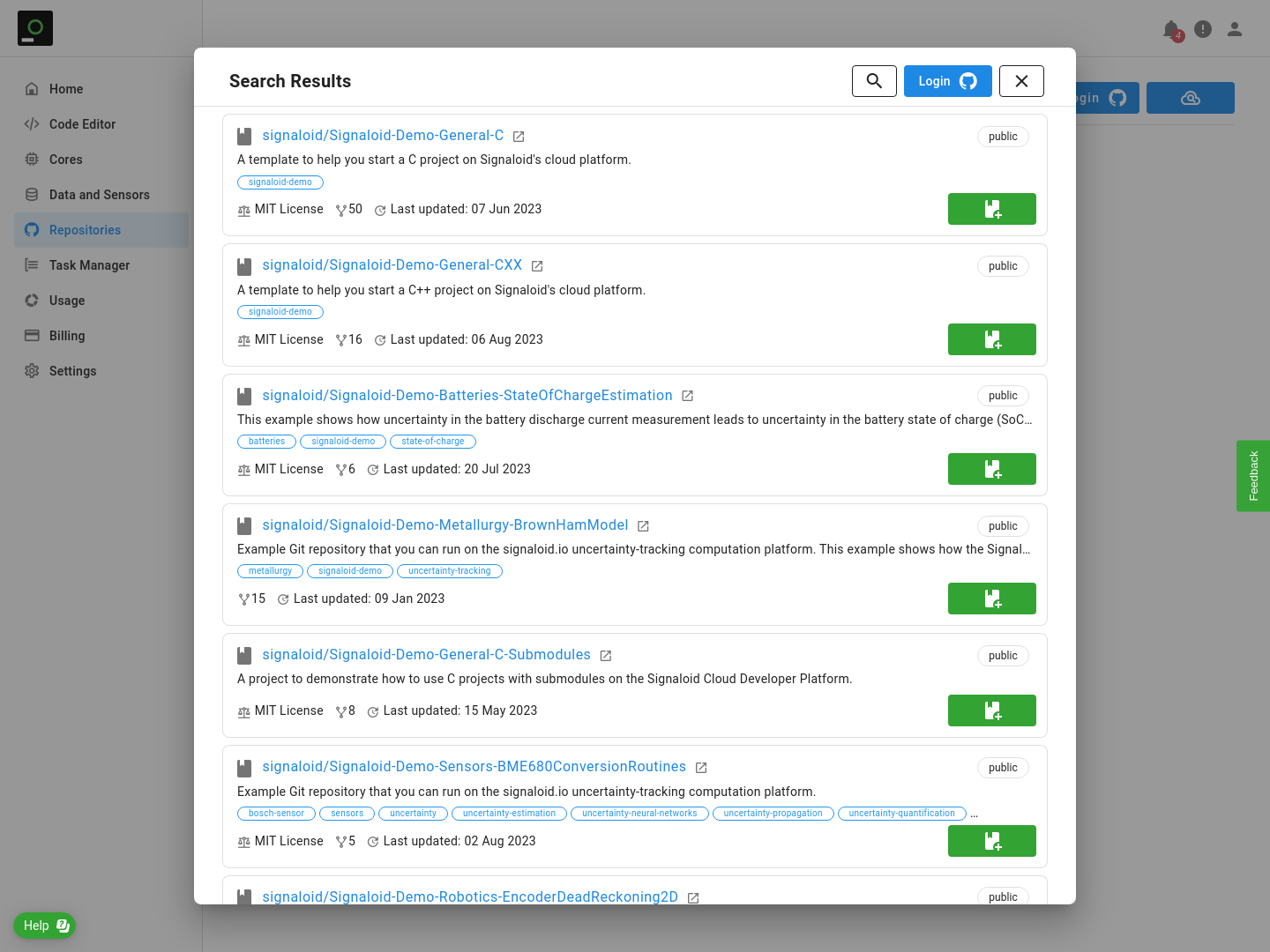 The Signaloid Cloud Developer Platform also allows you to connect your private repositories if you login to you GitHub account using the "Login to GitHub" button () in the Repositories page (see GitHub Login for more details).
