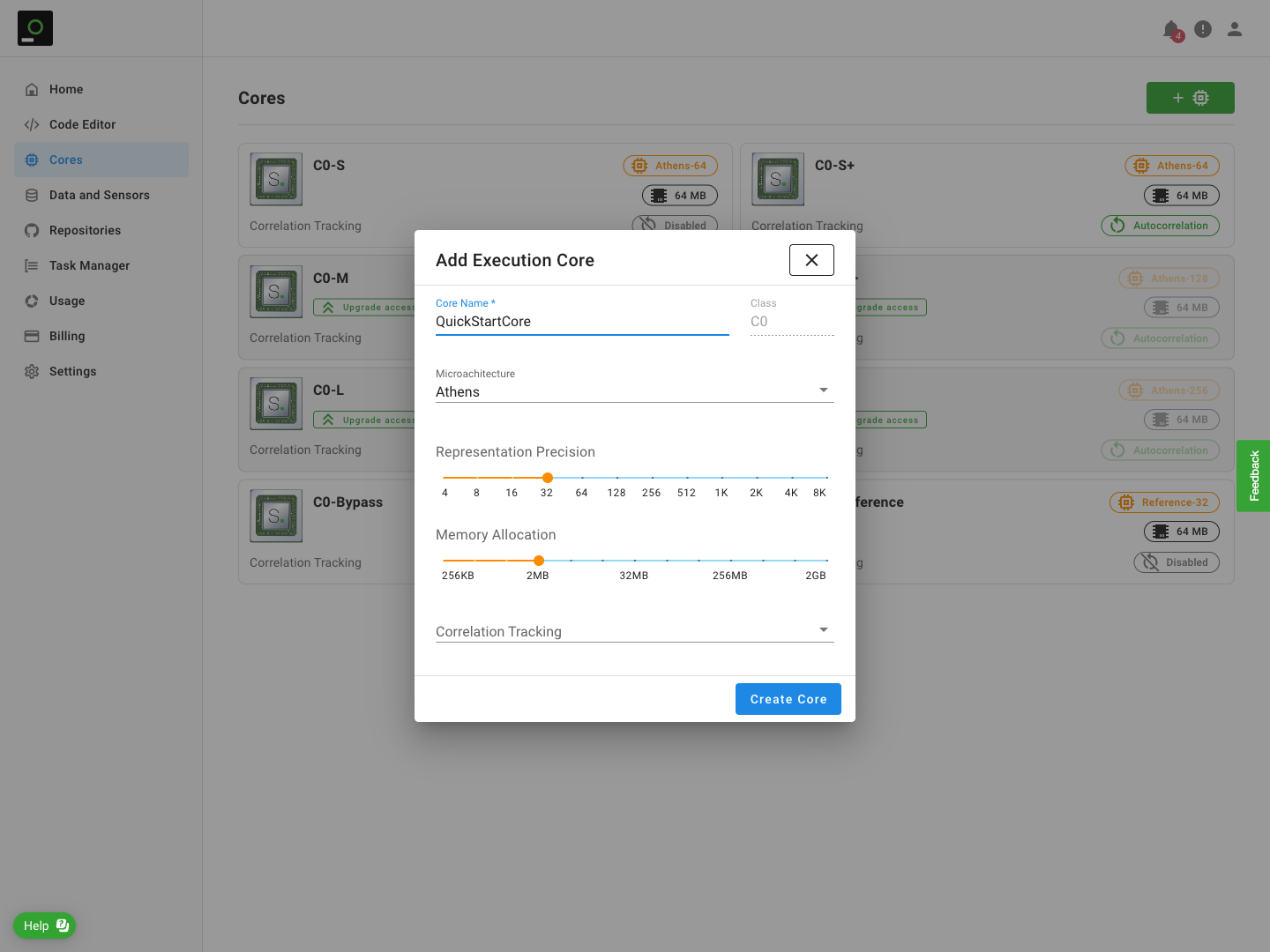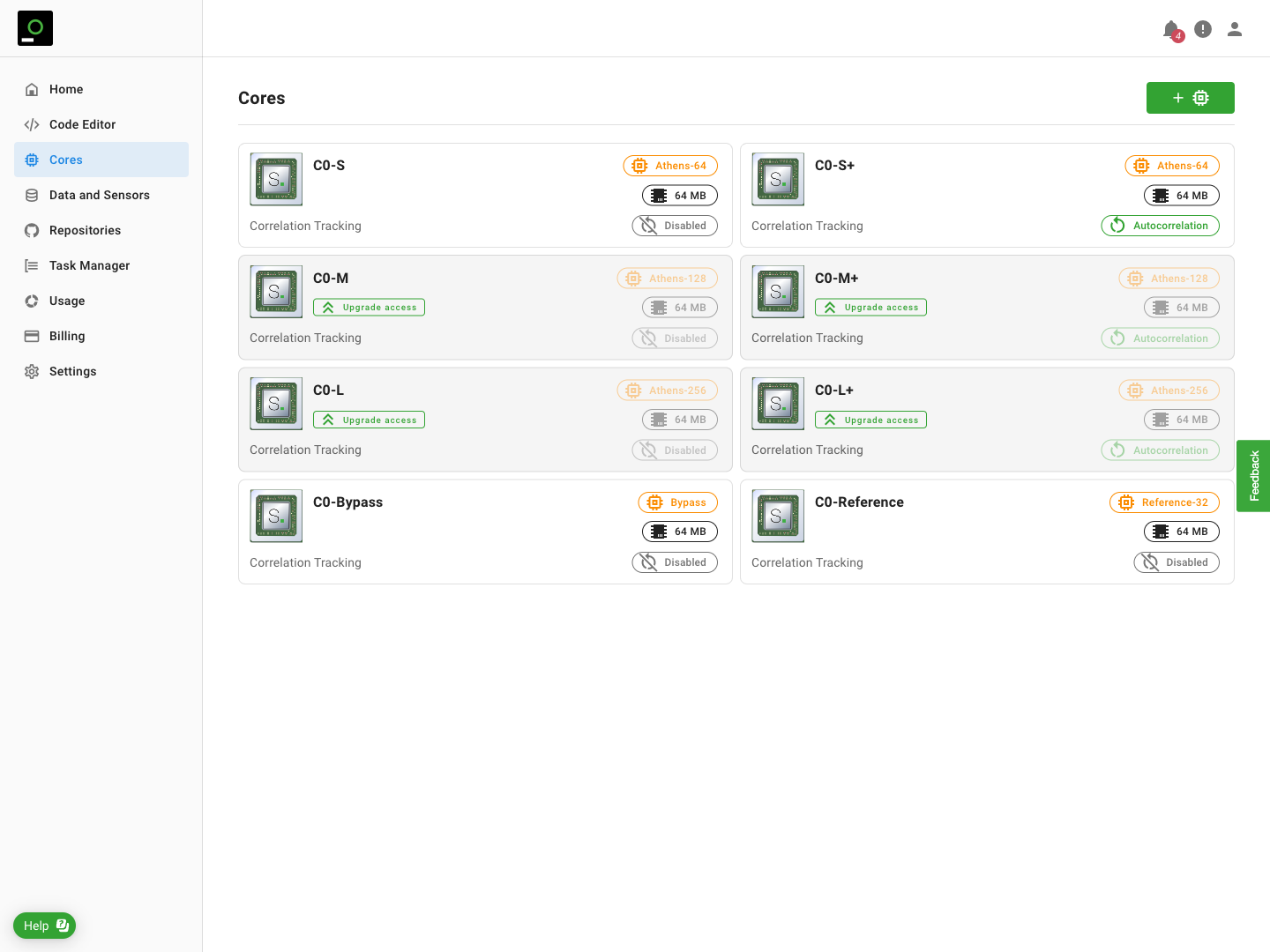 Use the Cores page (Figure 1, below) to select one of the default C0 Processor cores or to create a custom Signaloid C0 Processor Core. Using a custom Signaloid C0 Processor Core gives you the choice of the microarchitecture, the memory allocation, and whether the core should track autocorrelation within the data. You can create and configure custom Signaloid C0 Processor Cores by clicking on the green button (it looks like: ) in the upper right hand side of the Page. Figure 2, below, shows the process in action.