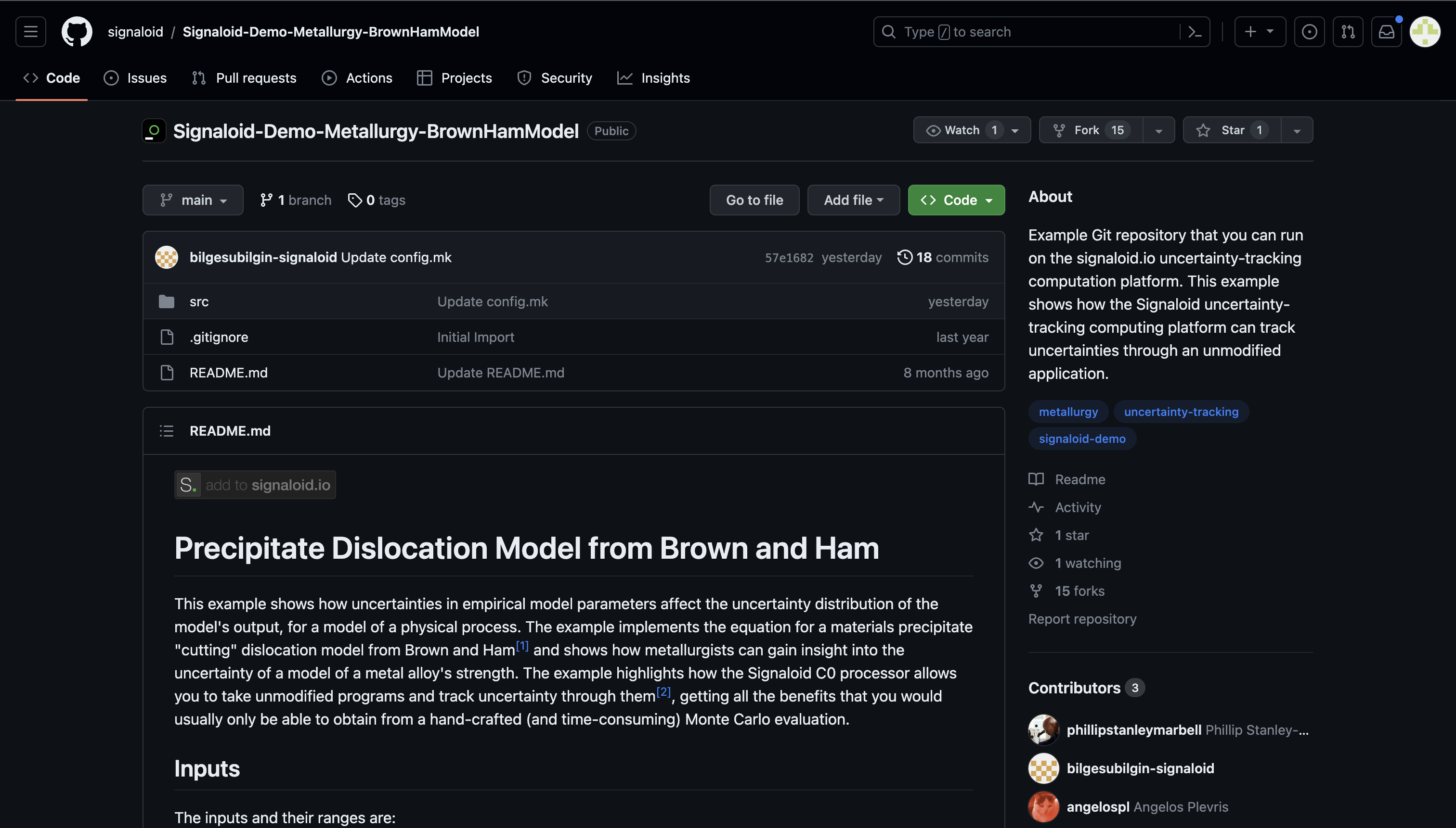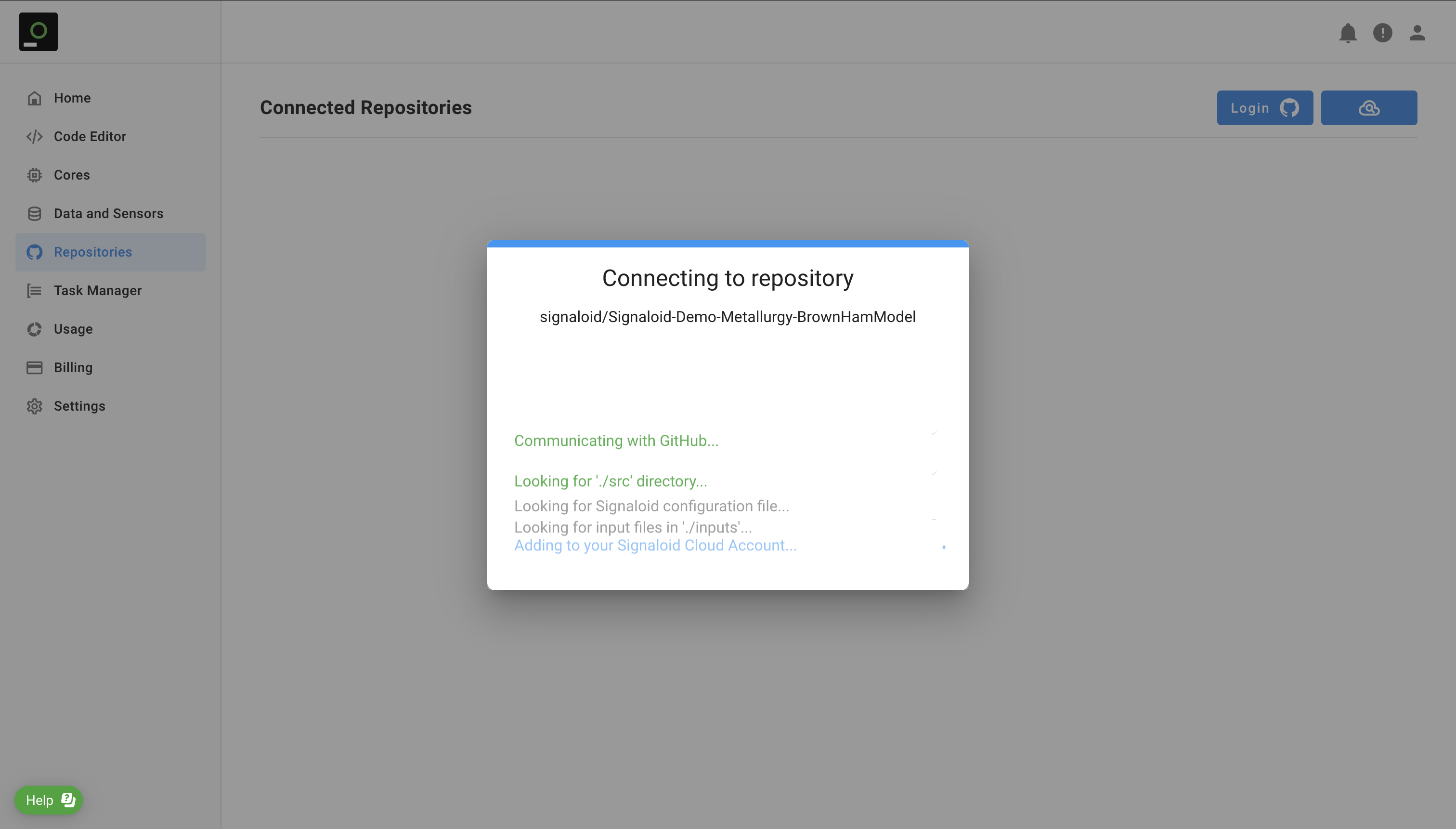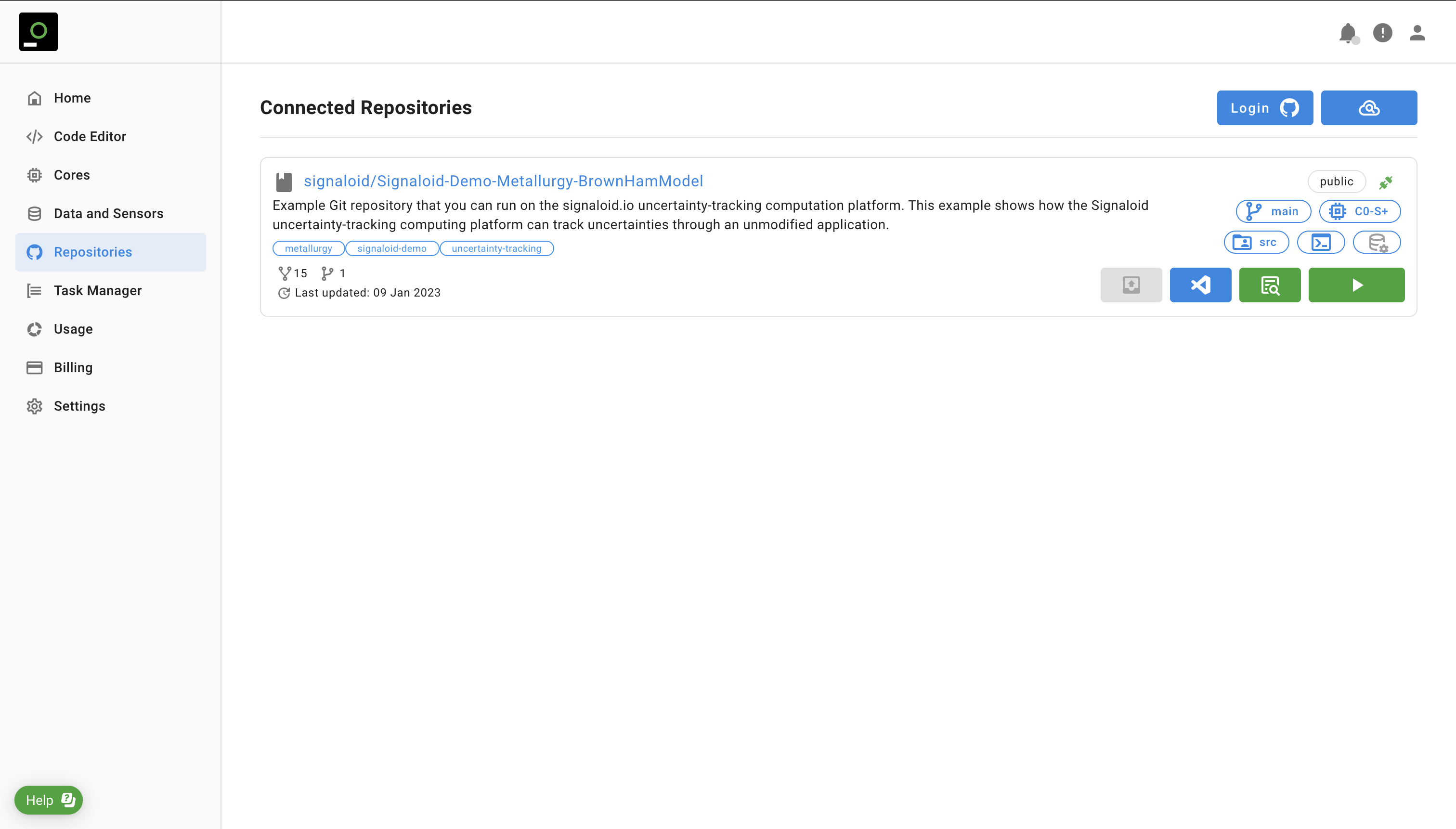 For any GitHub repository with the "add to signaloid.io" button correctly configured, you can add the repository to the list of code repositories accessible from your Signaloid Cloud Developer Platform account, with a single click: