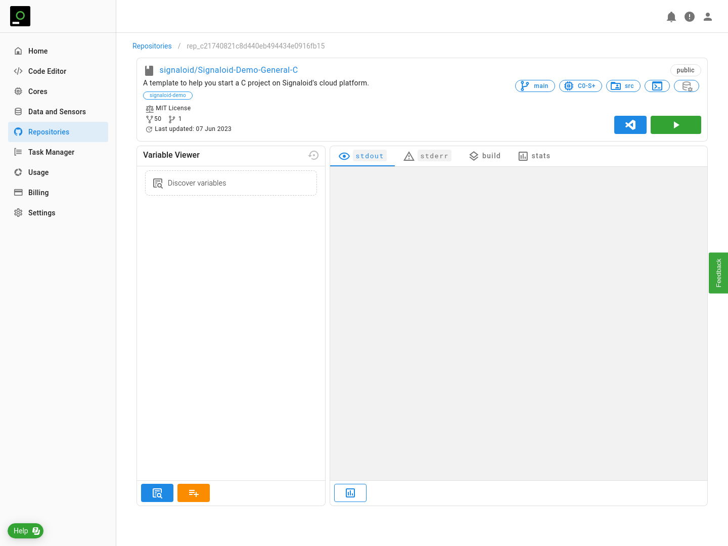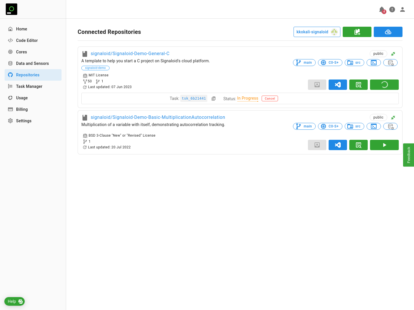 - To run a repository with basic configuration you just need to press the green play button () available on each of your connected repositories.
