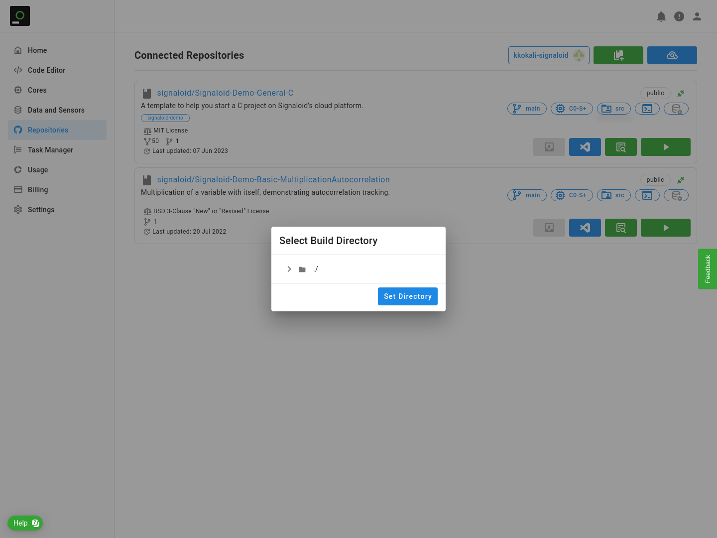Figure 1. Clicking `Build Directory` chip will show you a file explorer you can user to change the working path of your application.