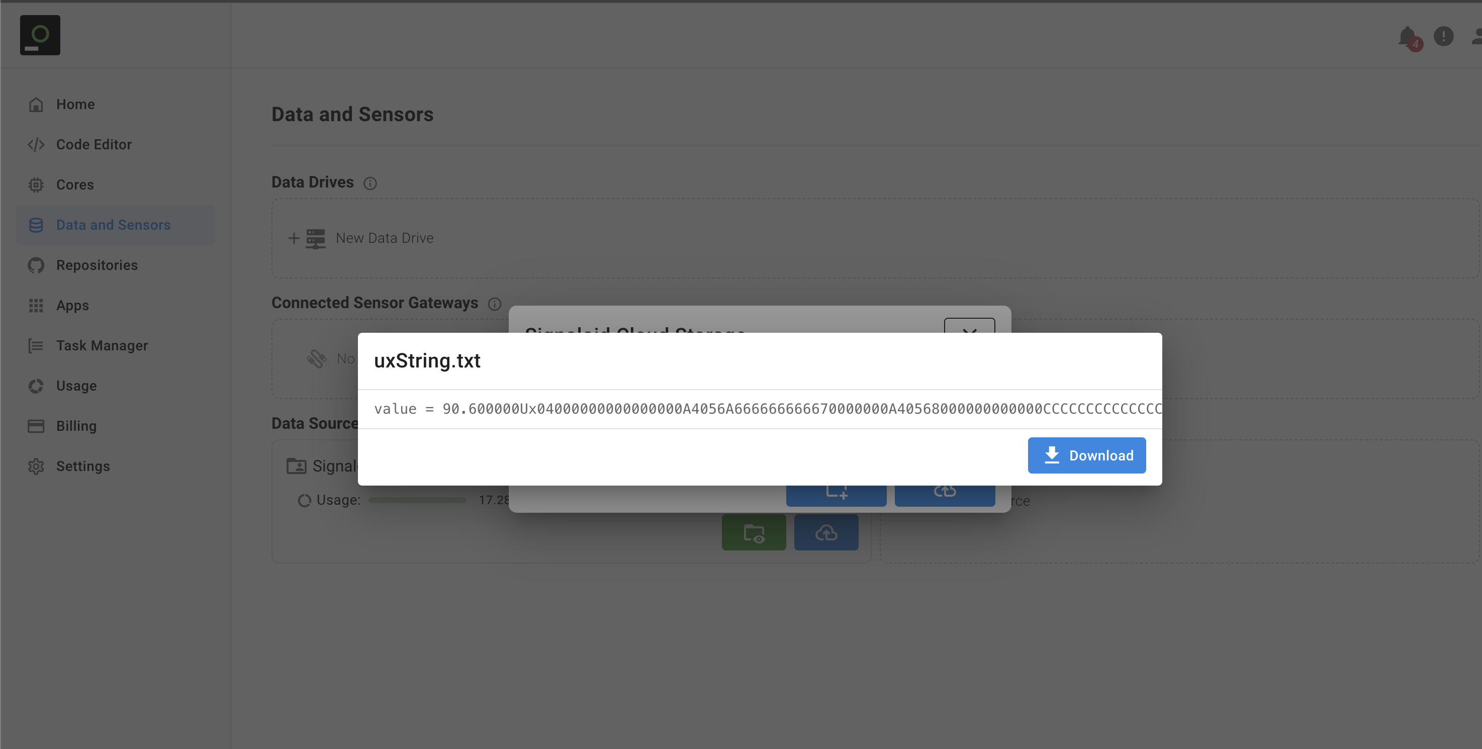 value encoded as a Ux String in the file uxString.txt in the Signaloid Cloud Data Storage. You can see the contents of the uxString.txt file as they appear in the Signaloid Cloud Data Storage in the Data and Sensors page.✏️ Example of ingesting a Ux String